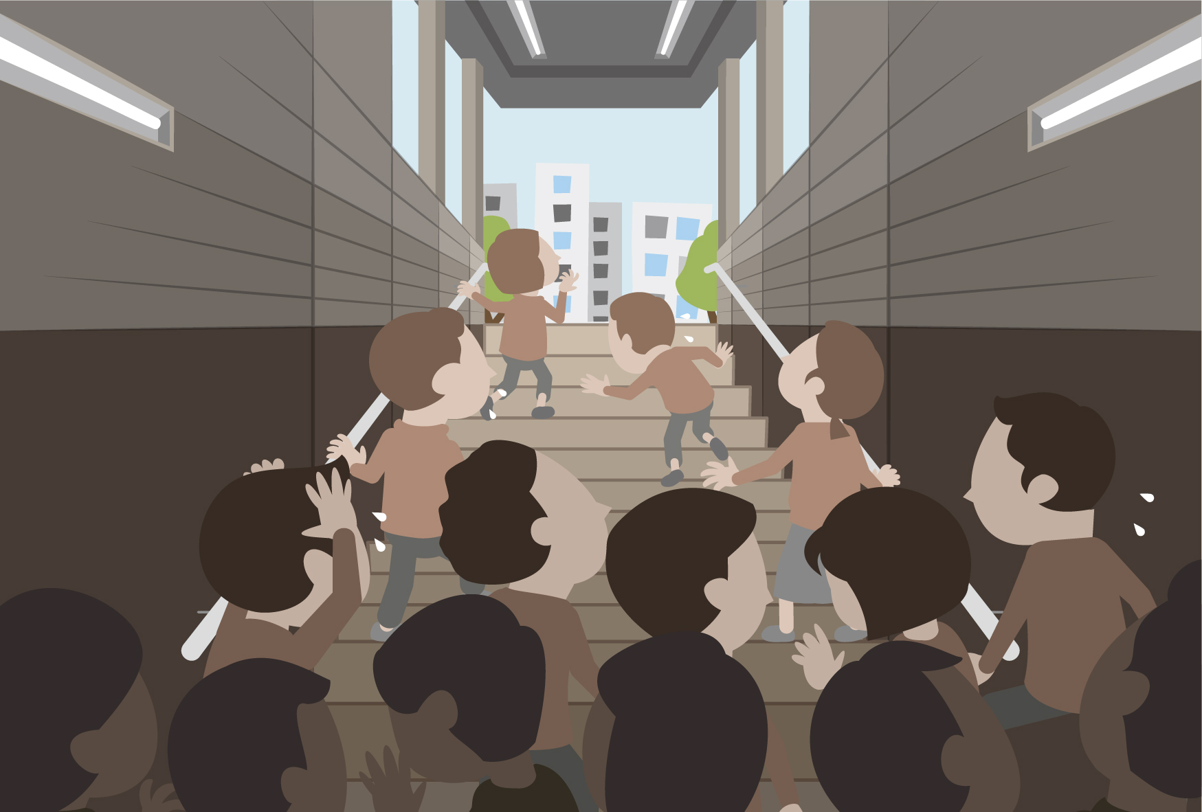 慌てた 人が 出口に 集まると、とても 危ないです。