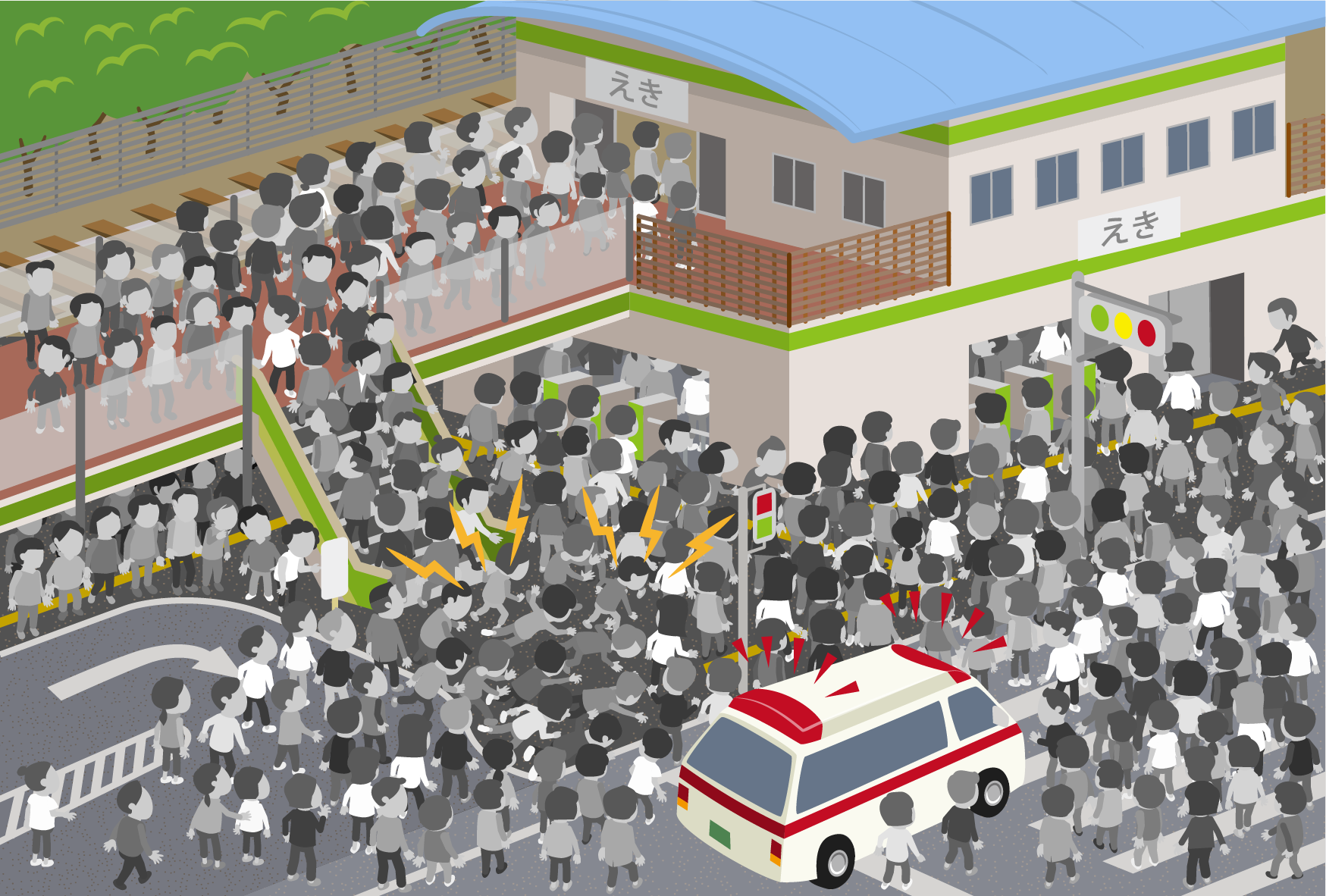 大きな災害の後、たくさんの人が一度に家に帰ろうとすると、駅の周りや道路が混んで危ないです。