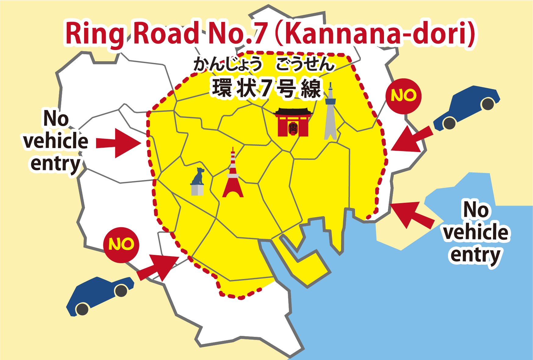 台風や大雨のときは、車が水に沈んでしまうこともあります。また、東京では大きな地震(震度6弱以上)が起きた後、環状7号線の外から中に車で入ることができなくなります。大きな道路は通ることができなくなります。