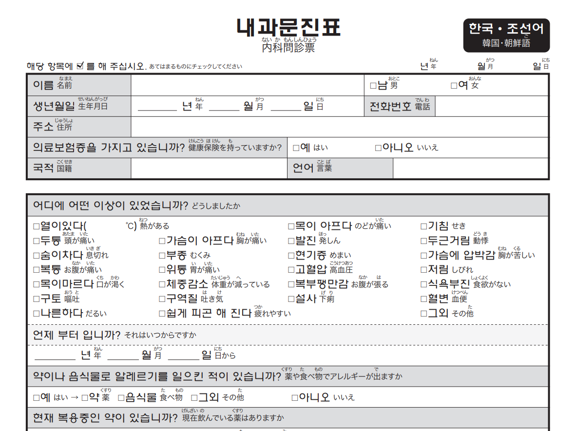 ■다국어 의료 문진표(NPO국제교류 하티코난다이・공익재단법인 가나가와 국제교류재단)