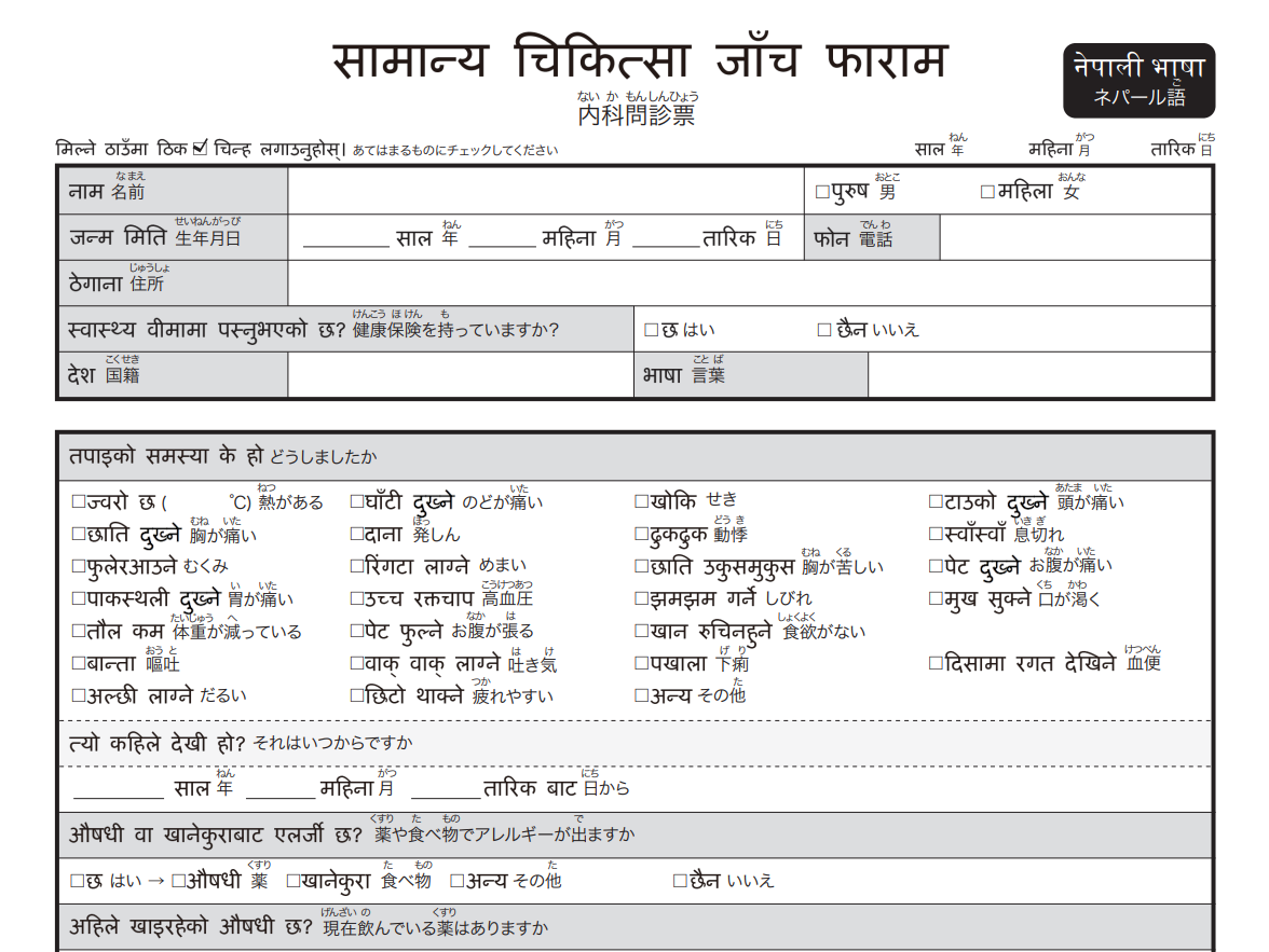 ■बहुभाषिक उपचारको जाँच फाराम (NPO इन्टरनेशनल कम्युनिटि हार्टी कोनान्दाइ/ कानागावा इन्टरनेशनल फाउन्डेसन)