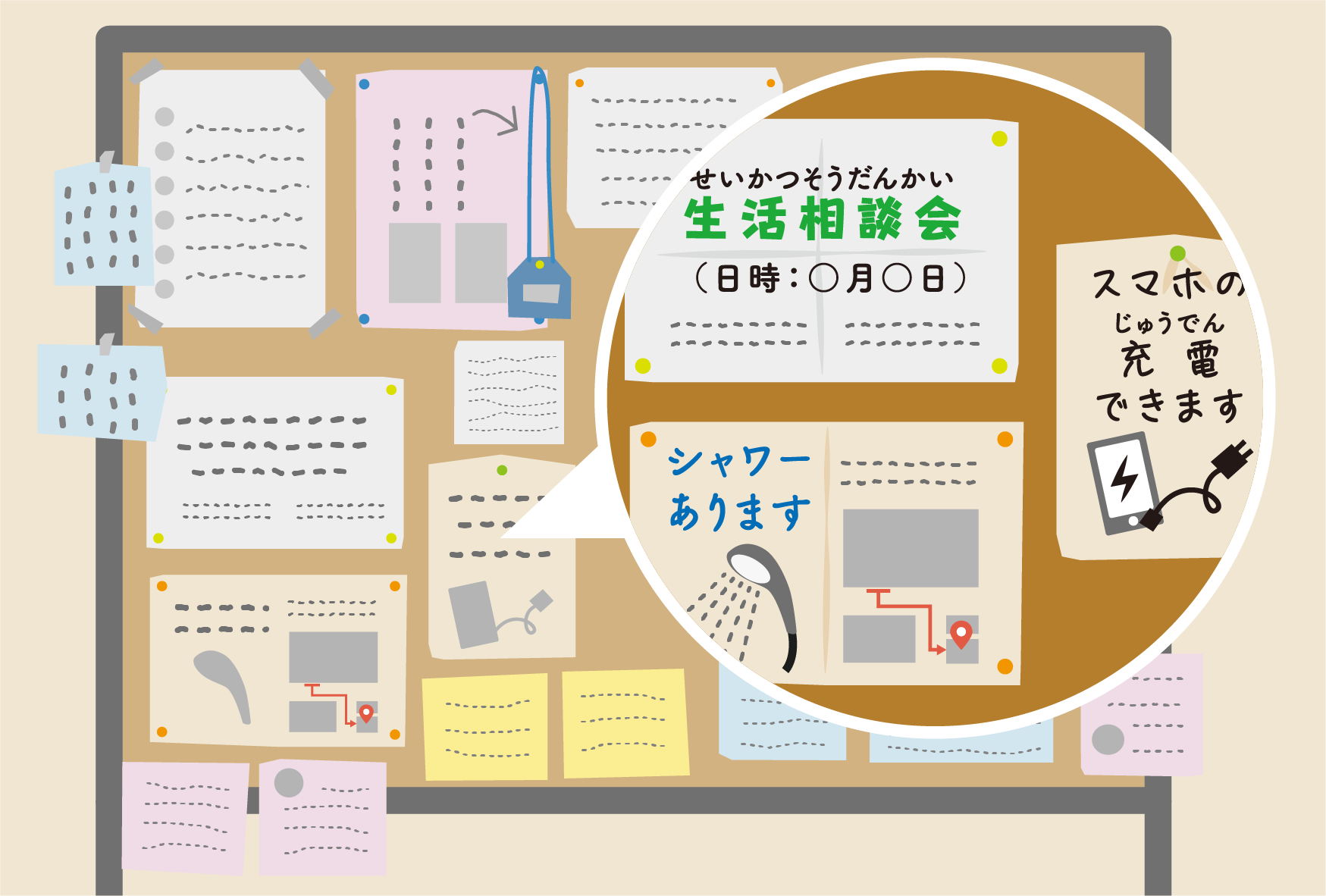 避難所には、お風呂はないことが多いです。お風呂のお知らせは、避難所の掲示板を見てください。