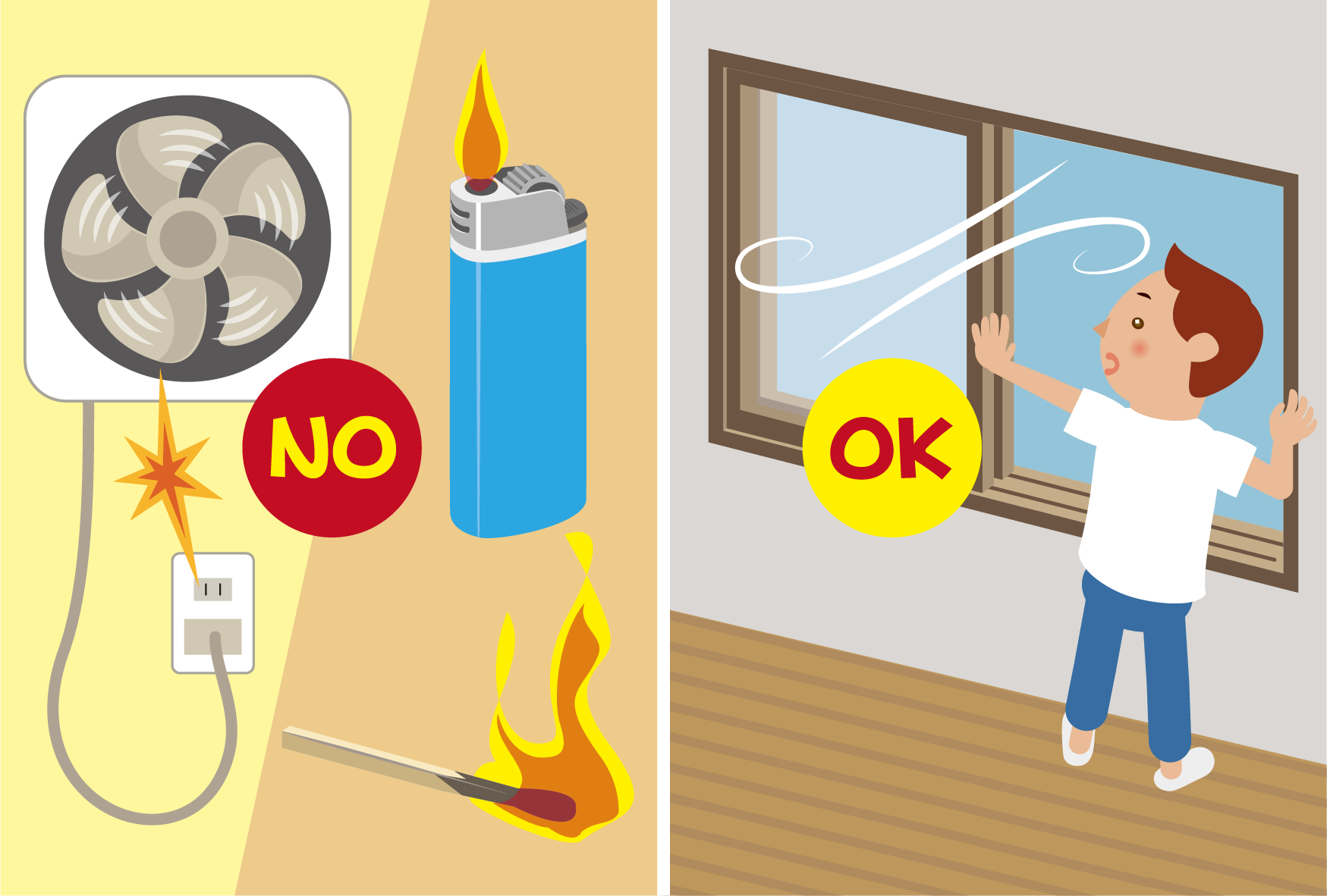 窓を開けて換気をしましょう。電気から火花が出るかもしれないので、換気扇は使いません。 ライターやマッチなどの火は、絶対に使わないでください。 すぐにガス会社に連絡してください。