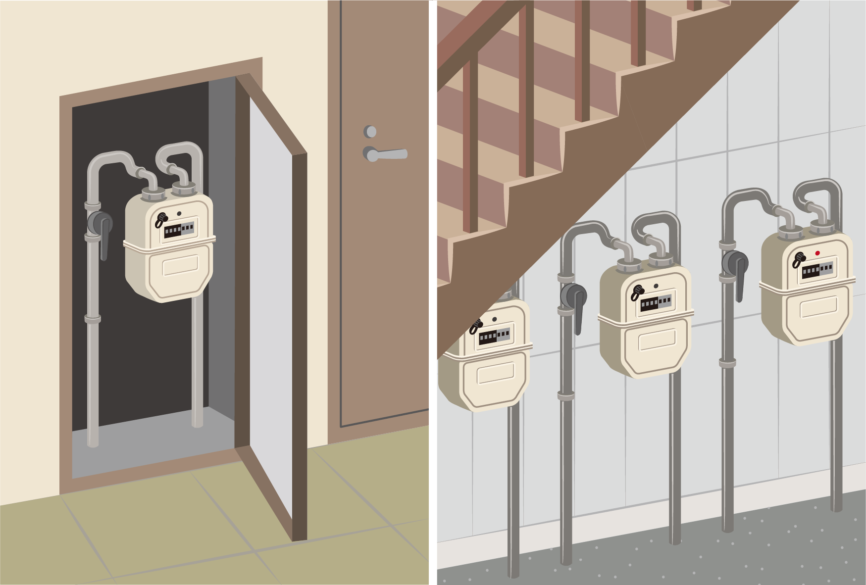 ガスメーターは、家の外や、マンションの廊下のボックスの中などにあります。 -