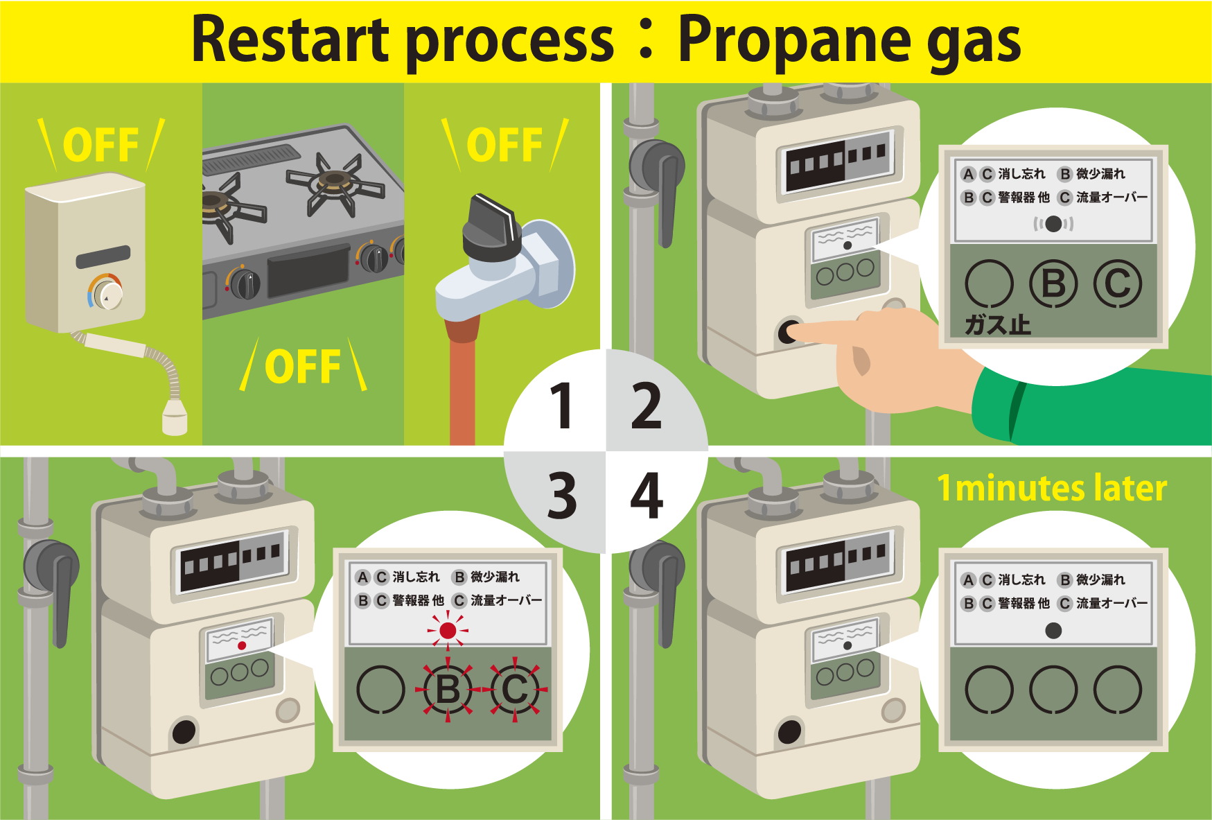 分 待ちます。赤いランプの点滅が消えたらガスを使うことができます。元栓を開いてください。 -