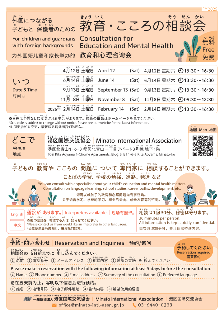 【Minato city】Consultation for Education and Mental Health for children and guardians with foreign roots -
