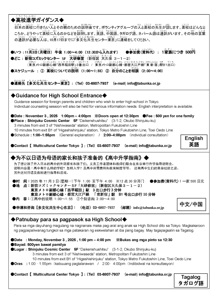 【Monday (Holiday), November 3】Guidance for High School Entrance @Shinjuku -