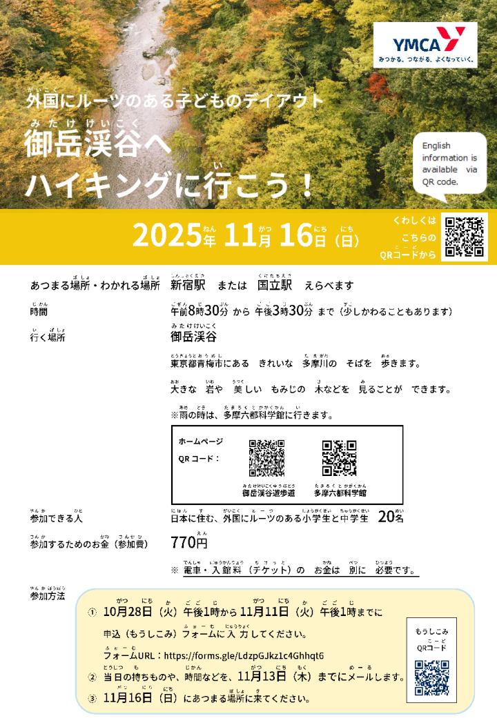 Dayout program for children with international backgrounds on November 16th ~Let's Go hiking in Mitake Gorge !~ -