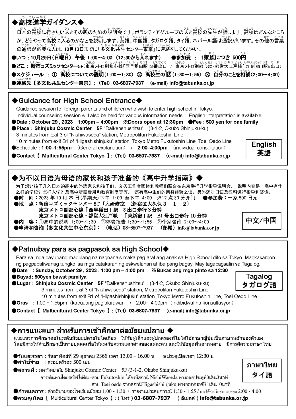 【Sunday, October 29】Guidance for High School Entrance @Shinjuku