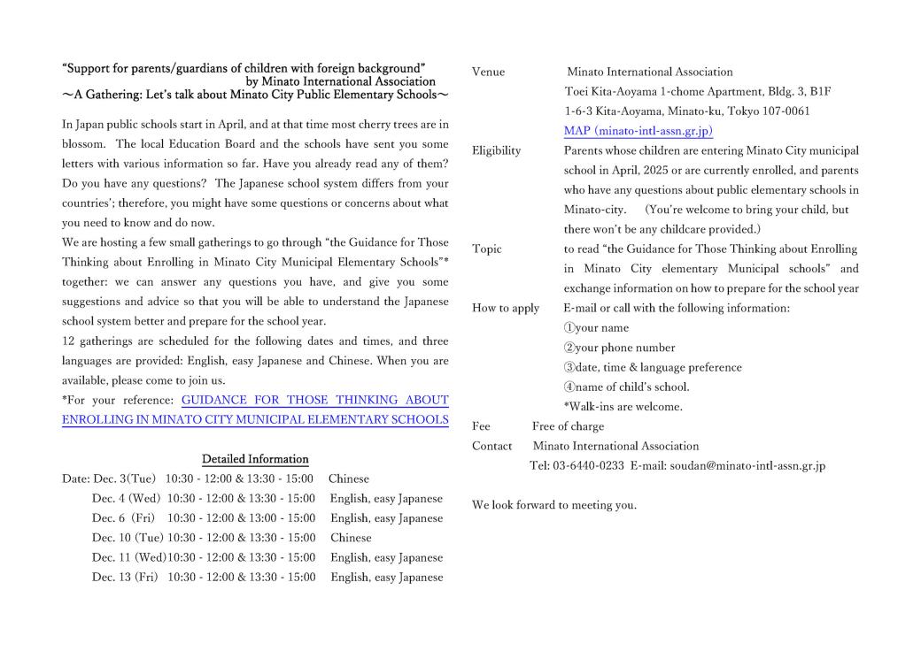 We are hosting a few small gatherings to go through "the Guidance for Those Thinking about Enrolling in Minato City Municipal Elementary Schools" together: we can answer any questions you have, and give you some suggestions and advice so that you will be able to understand the Japanese school system better and prepare for the school year.