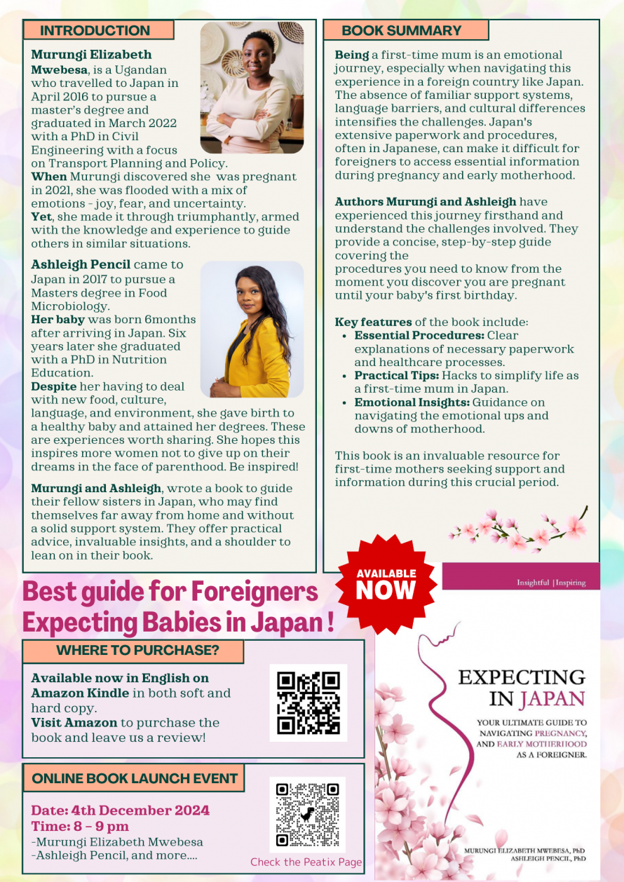 Online Launch of “Expecting in Japan: Your Ultimate Guide to Navigating Pregnancy and Early Motherhood as a Foreigner”, A Celebration of Murungi Elizabeth Mwebesa (PhD) & Ashleigh Pencil (PhD) Latest work with special guest, Junko Nasu Dagba (Associate professor in the department of nursing, Kyoto Tachibana University)