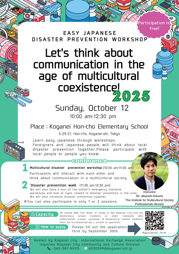 [Koganei city] Oct. 12 (Sun) Easy Japanese Disaster Prevention Workshop "Let's think about communication in the age of multicultural coexistence!"