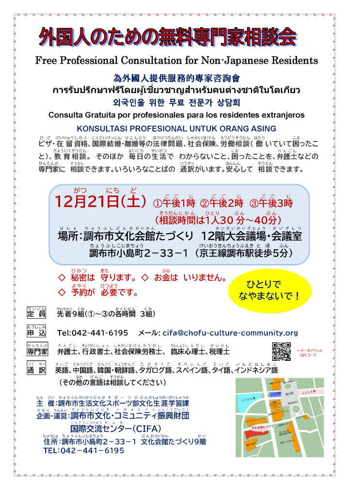 【2024/12/21(Sat.)】Free Consultation for Foreign Residents is held in Chofu-shi -