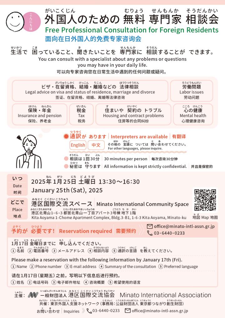 【2025/1/25(Sat.)】Free Consultation for Foreign Residents is held in Minato-ku -