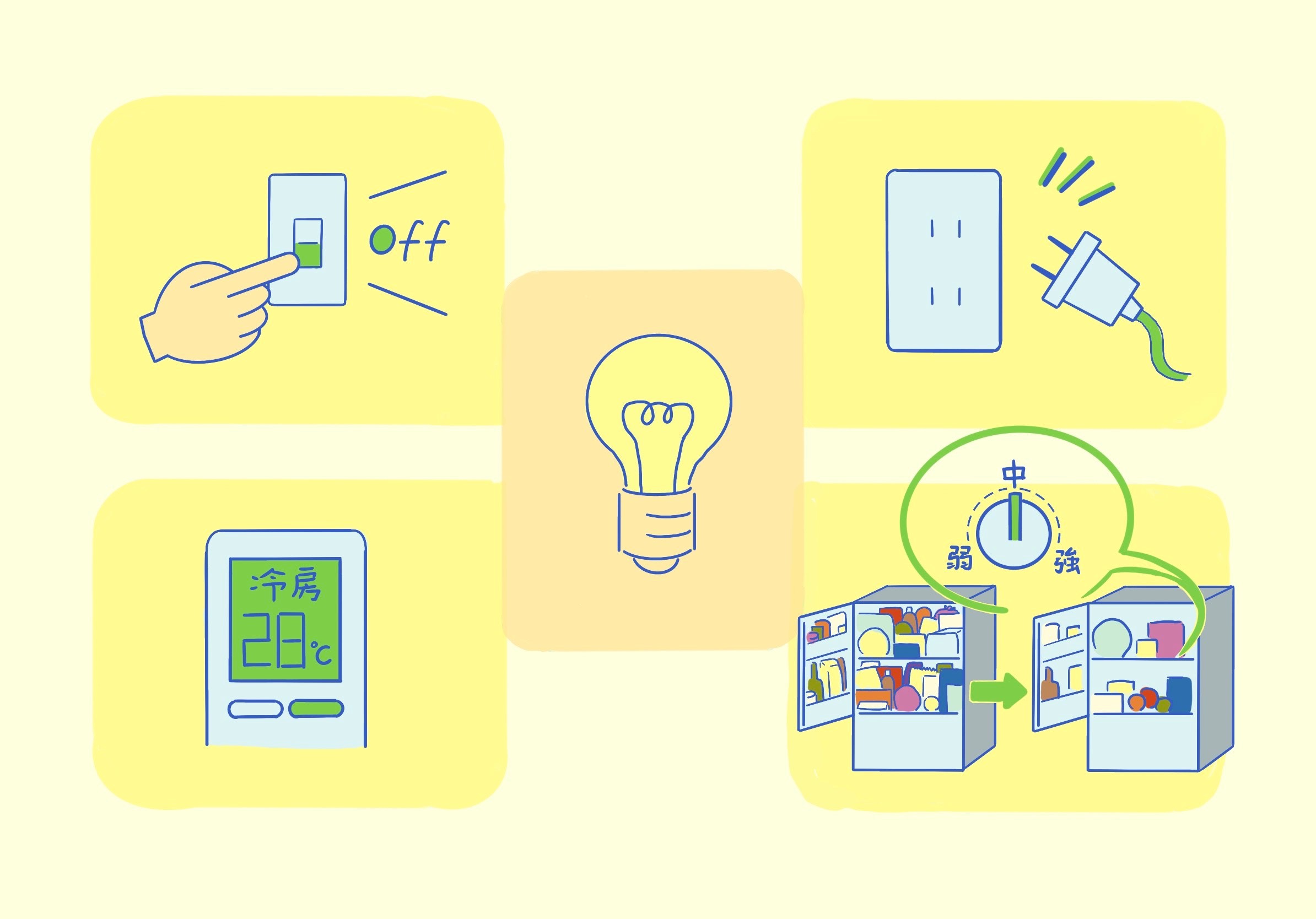 Saving electricity at times when power is in short supply is called "setsuden". Electricity is especially in short supply from evening to night. The reason is that we use a lot of electricity when we come home, turn on the lights and air conditioner, and prepare meals for the evening. If there is not enough electricity, the power will go out. So, please be aware of setsuden.