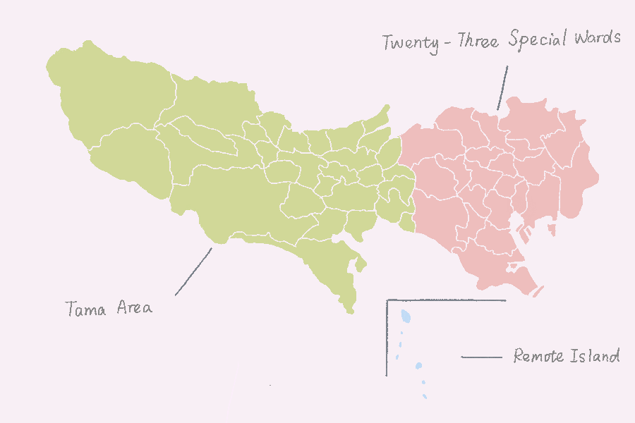 Measured from its easternmost to westernmost points, Tokyo looks wide. Its eastern region is home to twenty-three special wards. There, we find a high concentration of schools, companies, and important national organizations. In its western region, we find the Tama area; with abundant nature, mountains, and lakes. This area is also divided into twenty-six cities, five towns, and eight villages. Within Tokyo's borders, we also find many islands; including the Izu islands, and the Ogasawara islands; the latter being one-thousand kilometers away from the mainland.