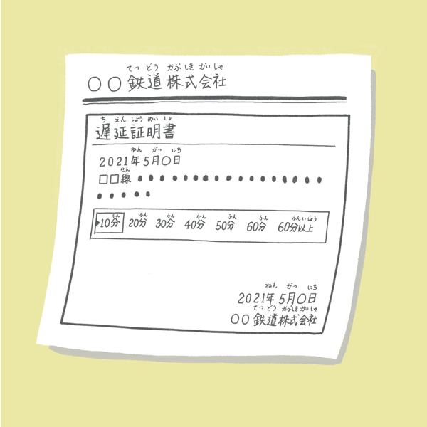 Because so many people live in Tokyo, trains tend to be quite crowded during the hours when people are headed to work or to school. Trains tend to run on time, however - due to accidents and other trouble – delays sometimes happen. Announcements in regards to the delays may be heard from speakers in trains and in stations, so please remain alert. When a train is late due to some manner of trouble, you may obtain a "Train Delay Certificate" (遅延証明書/"Chien Shomeisho" ) from the train company. When in possession of one of these certificates, you will not be judged as being late for school or for work. They may be obtained from the station staff, or be downloaded from the train company's HP.