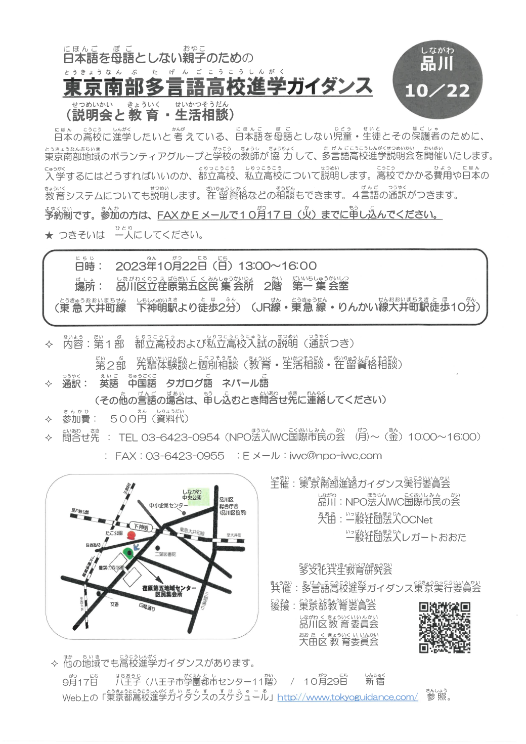 【10月22日(日曜日)】日本語を 母語としない 親子のための 多言語高校進学ガイダンス(説明会と 教育・生活相談)@品川