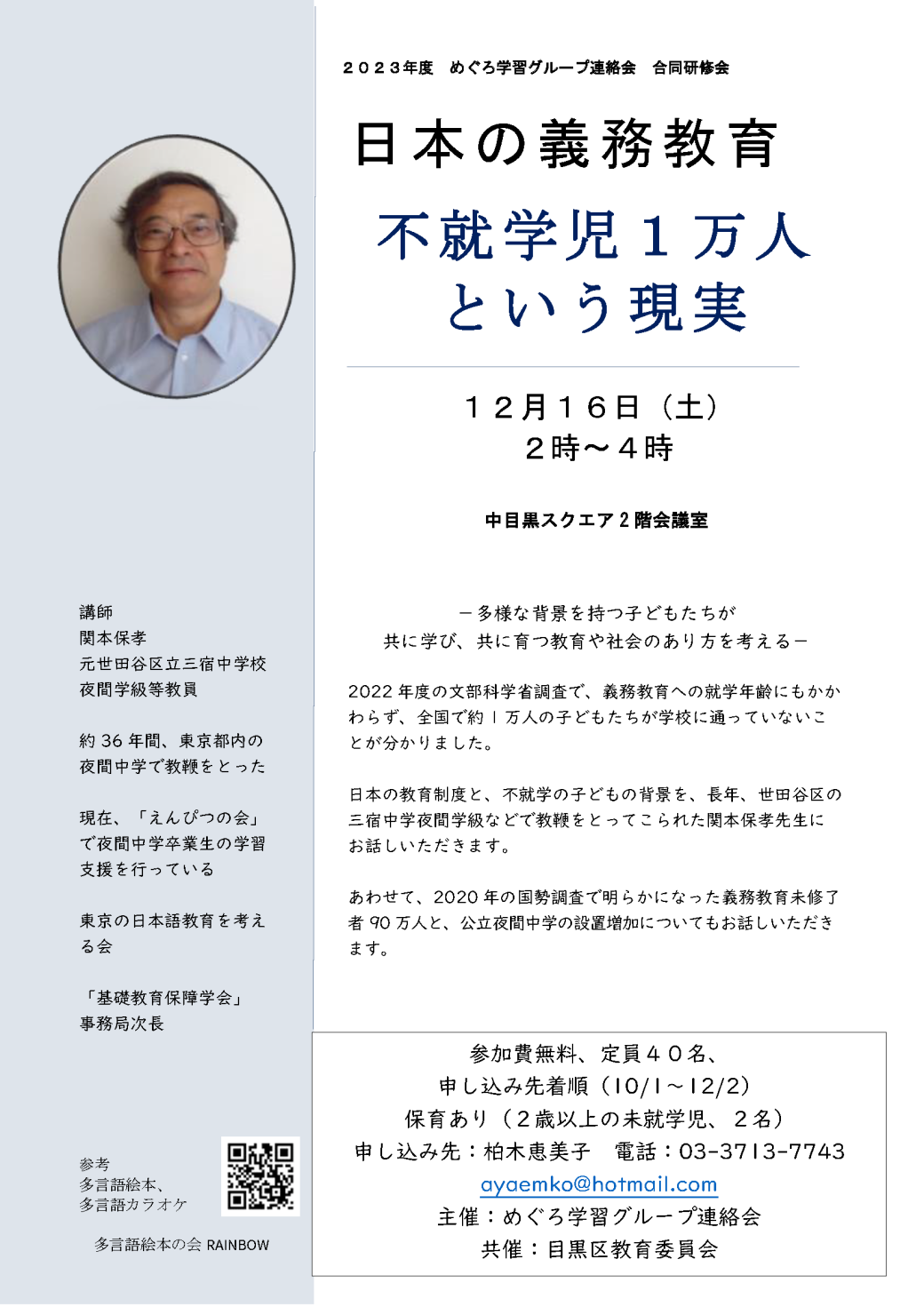【研修会のお知らせ】日本の義務教育~不就学児1万人という現実~