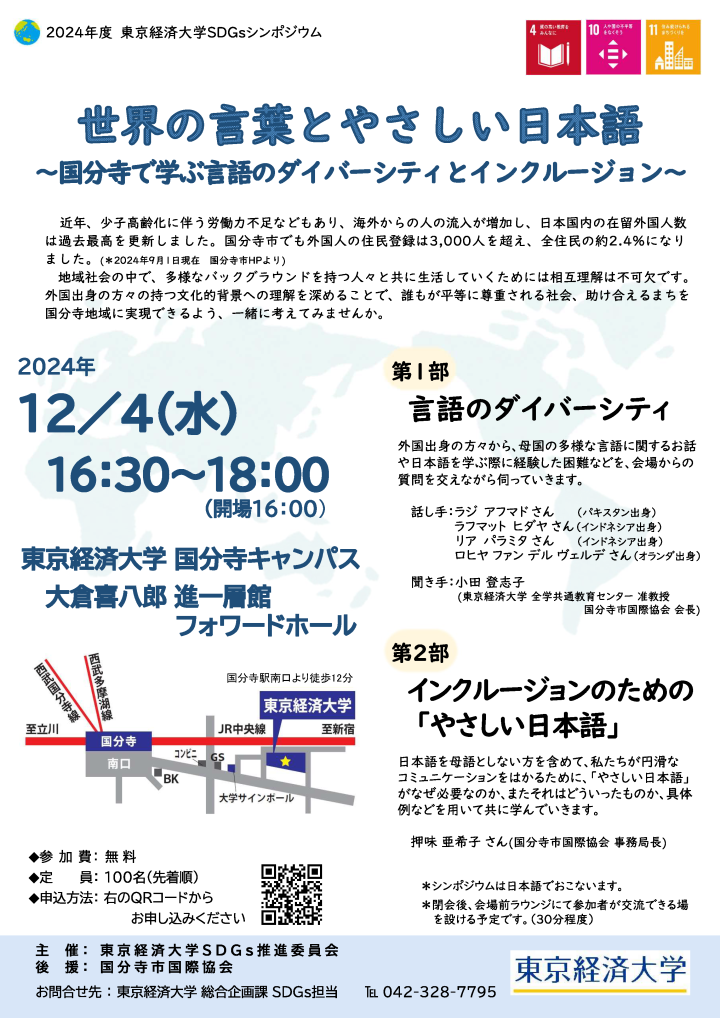 2024年度 東京経済大学SDGsシンポジウム「世界の言葉とやさしい日本語~国分寺で学ぶ言語のダイバーシティとインクルージョン~」 -