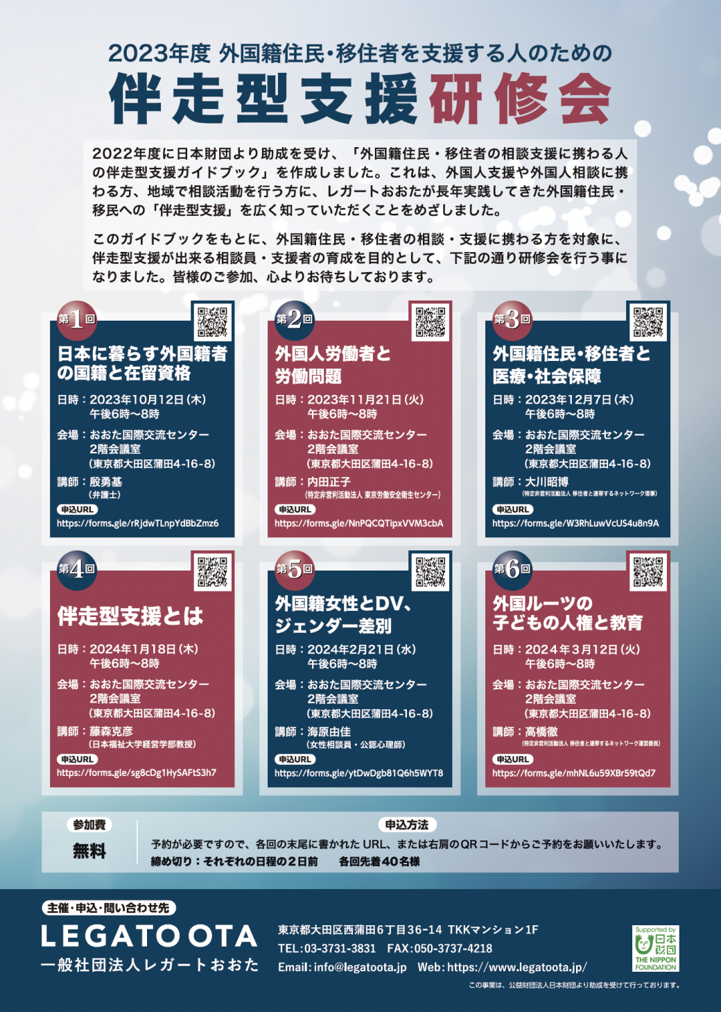 これは、外国人支援や外国人相談に携わる方、地域で相談活動を行う方を対象に、レガートおおたが長年実践してきた外国籍住民・移民への「伴走型支援」を広く知っていただくことをめざしました。
