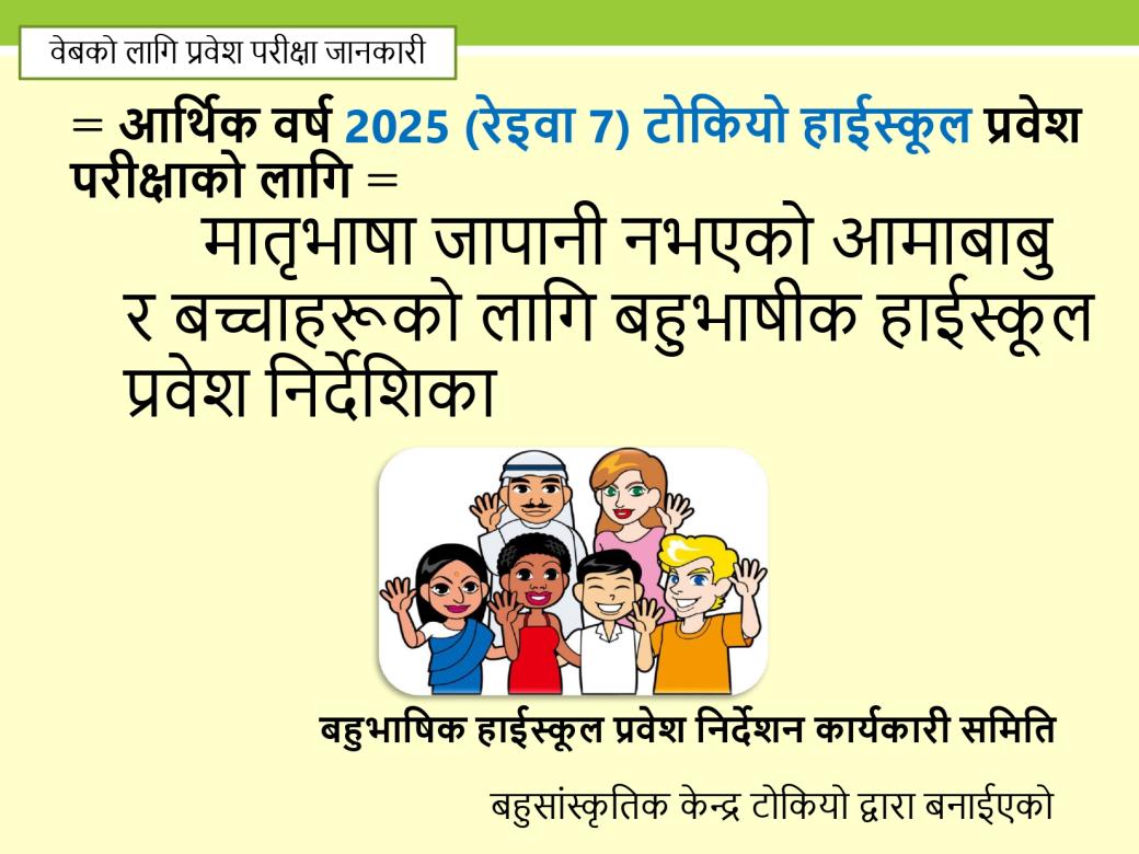 हामीले २०२५ टोकियो हाई स्कूल प्रवेश परीक्षाको तयारीमा मातृभाषा जापानी नभएका अभिभावक र बालबालिकाका लागि बहुभाषी हाईस्कूल प्रवेश मार्गनिर्देशन (नेपाली संस्करण) सिर्जना गरेका छौं।