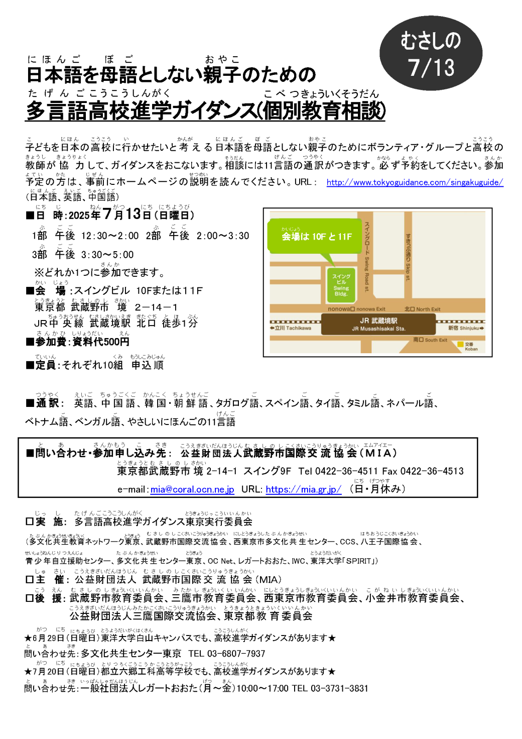 7/13(日曜日)【武蔵野】日本語を 母語としない 親子のための 多言語 高校 進学ガイダンス(個別教育相談)