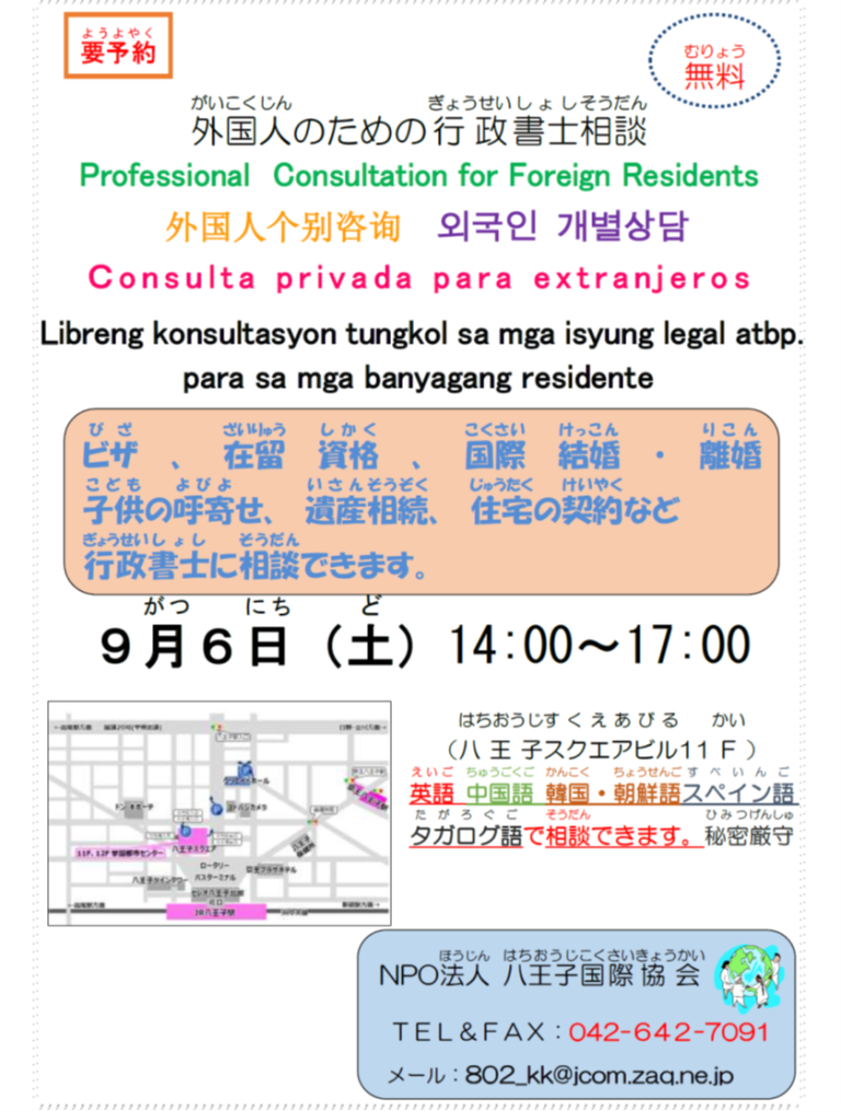 【八王子市】外国人のための行政書士相談会[ 9月 6日(土曜日)]