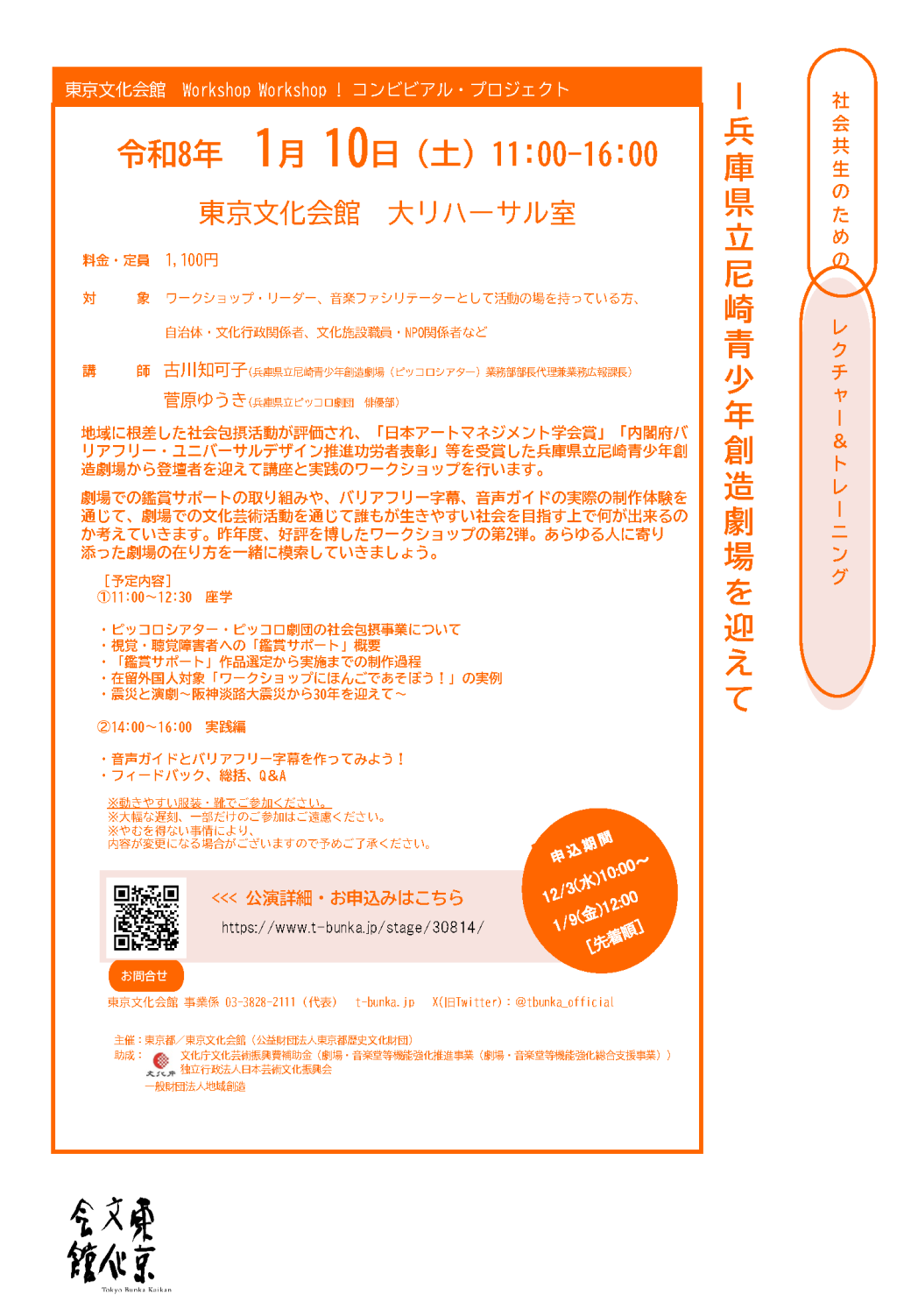 地域に根差した社会包摂活動が評価され、「日本アートマネジメント学会賞」「内閣府バリアフリー・ユニバーサルデザイン推進功労者表彰」等を受賞した兵庫県立尼崎青少年創造劇場から登壇者を迎えて講座と実践のワークショップを行います。