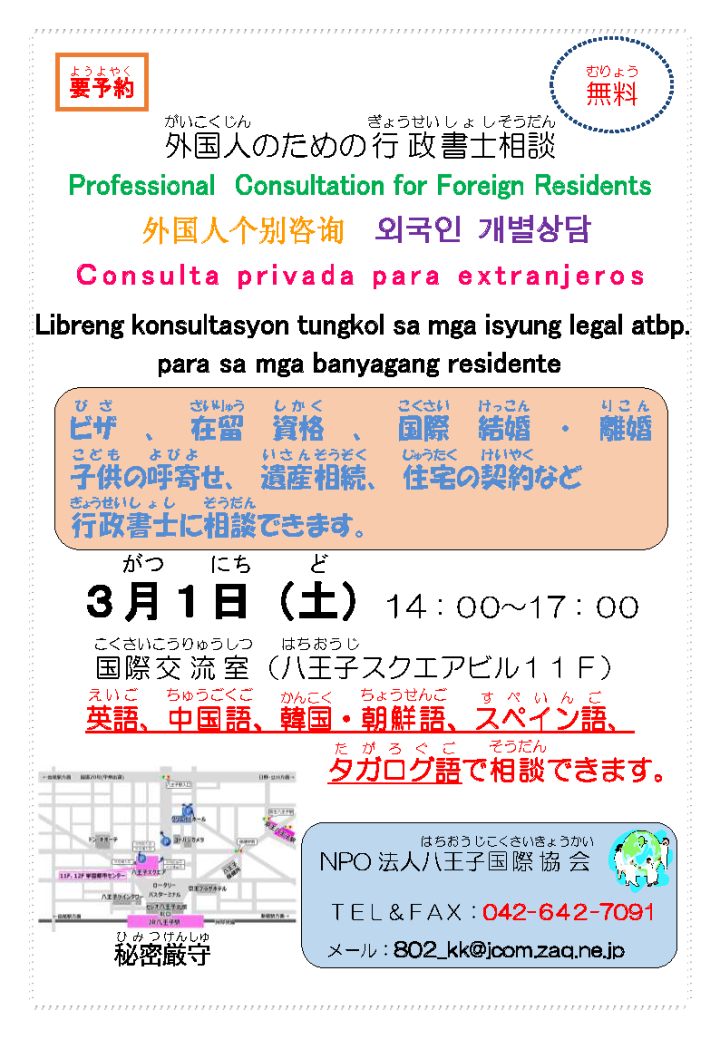 【八王子市】外国人のための行政書士相談会(2月1日(土曜日)) -