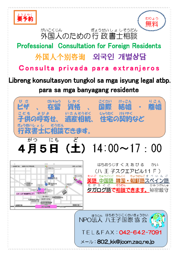 【八王子市】外国人のための行政書士相談会[4月5日(土曜日)] -