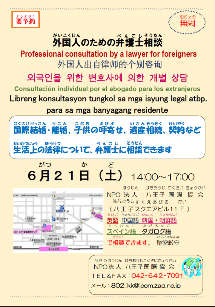 【八王子市】外国人のための弁護士相談[6月21日(土曜日)] -