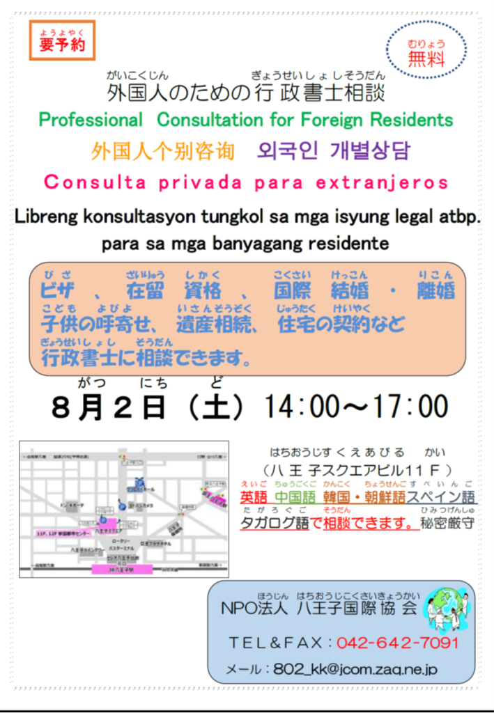 【八王子市】外国人のための行政書士相談会[ 8月 2日(土曜日)] -