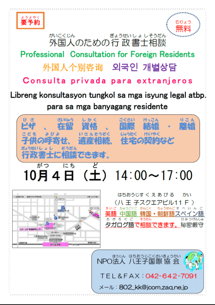 【八王子市】外国人のための行政書士相談会[ 9月 6日(土曜日)] -