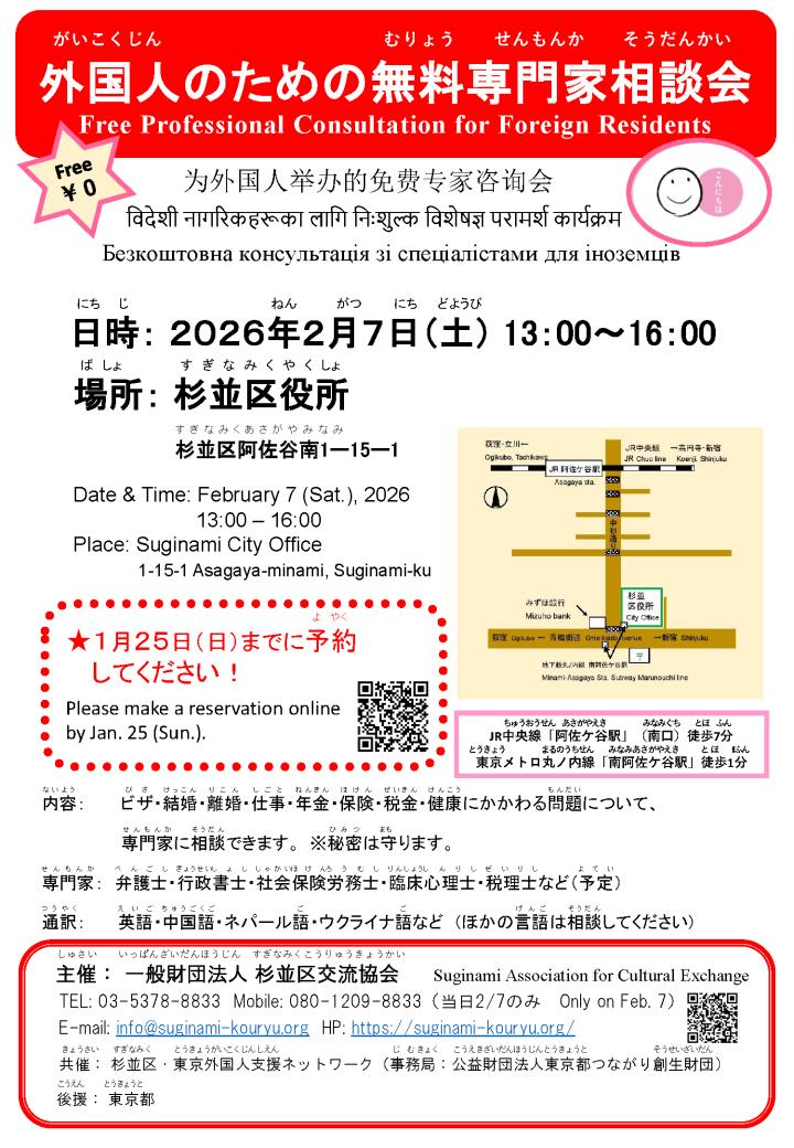 【2026年2月 7日 土曜日】杉並区で 外国人のための 相談会が あります。 -