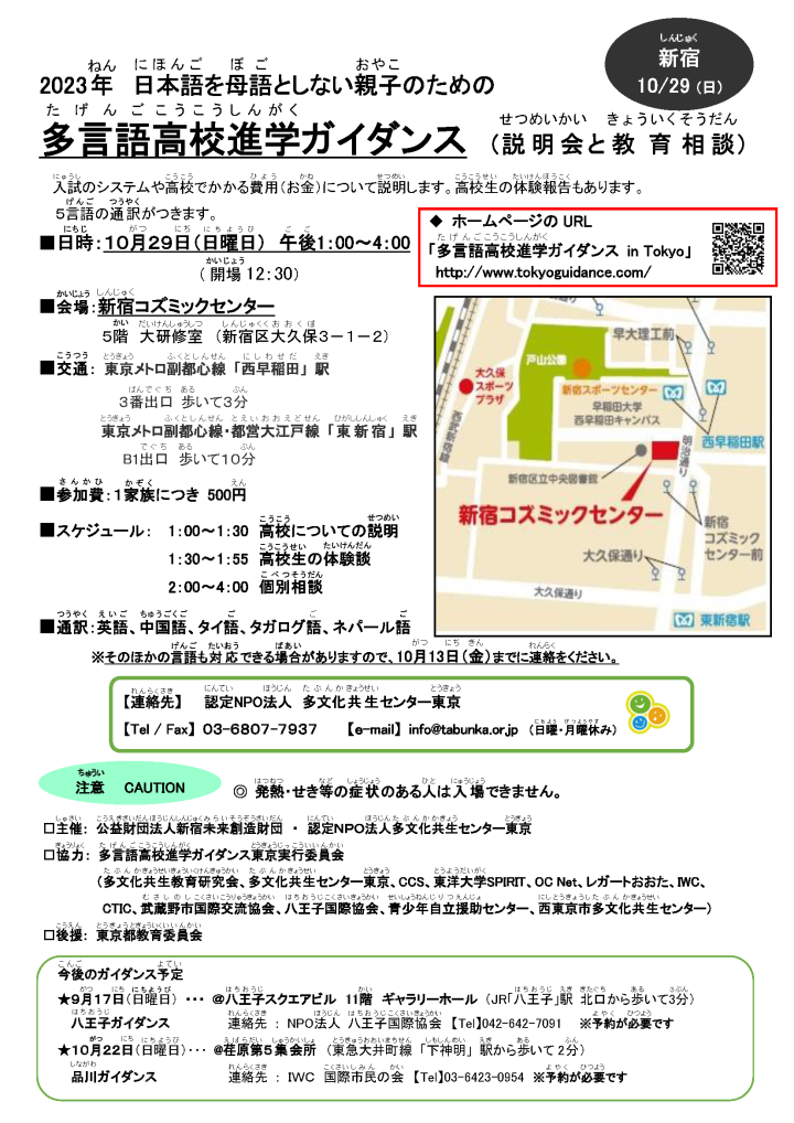 国籍や言語、文化の違いをお互いに尊重する社会を目指しています。外国にルーツを持つ子どもたちの教育、とくに高校進学支援に力を注いでいます。火曜日から金曜日は主に9年間の義務教育を終了した子どもたちを対象に「たぶんかフリースクール」(荒川校・杉並校)を運営しています。土曜日には、ボランティアによる学習支援教室を行い、学びと交流の場を設けています。また、高校進学ガイダンスの開催や教育相談を行っています。
