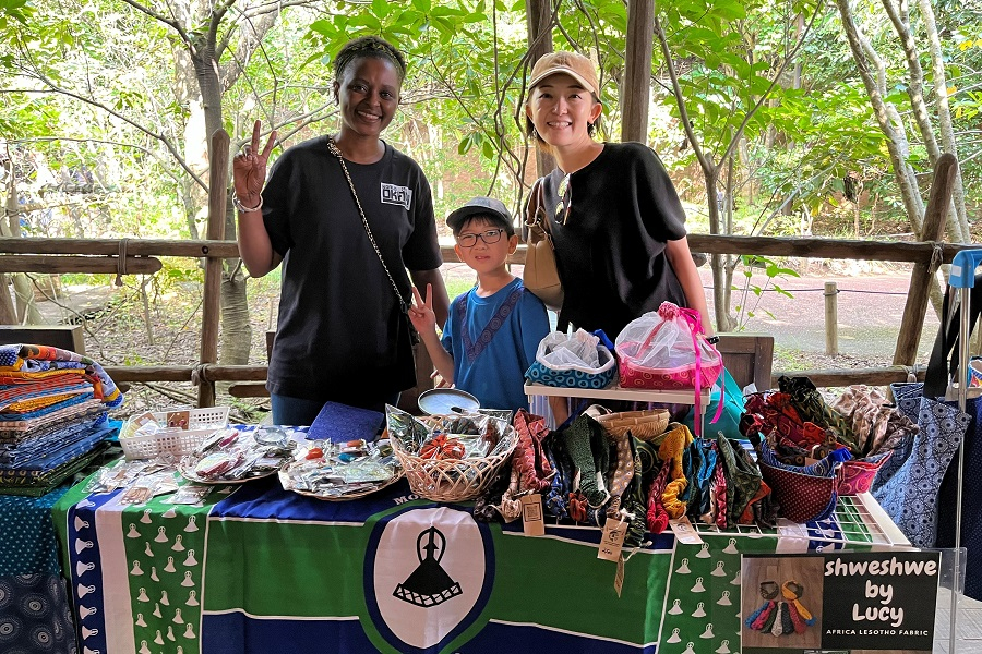 そうした思いが、DANROの3つ目の活動「いっしょに活動する」にもつながっています。この活動で特に人気なのが、ルーシーさんの母国レソト王国の「シュエシュエ(Shwe Shwe)」という布を使った小物づくりのワークショップです。コットン100%の素材に幾何学模様がプリントされており、洋服やヘアアクセサリー、小物などを作ります。「民族 によって使用するカラーが異なります。私の民族はグリーンを使います」と、ルーシーさん。