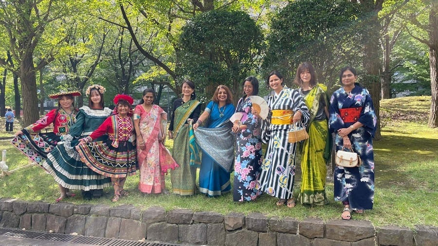 団体では毎年、大島六丁目団地秋祭りに参加し、「民族衣装お試しイベント」を行っています。リーパさんがインドのサリーと浴衣を着るイベントを企画したところ、他のメンバーも賛同し、ベトナムのアオザイやペルーのドレスといった多様な民族衣装が集まりました。