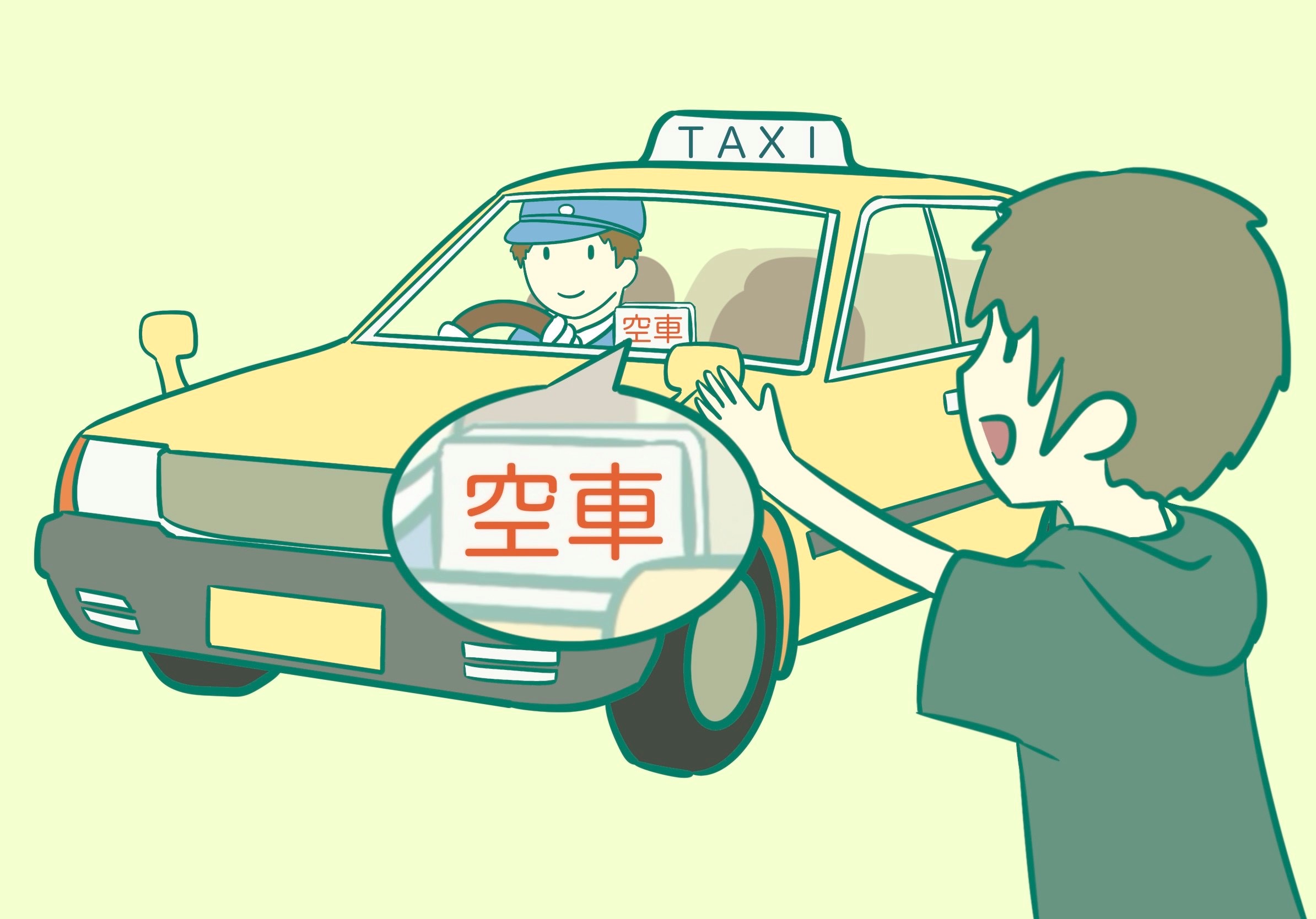 道を 走っている タクシーを 使うときは、タクシーの フロントガラスに ある 文字を 見ます。