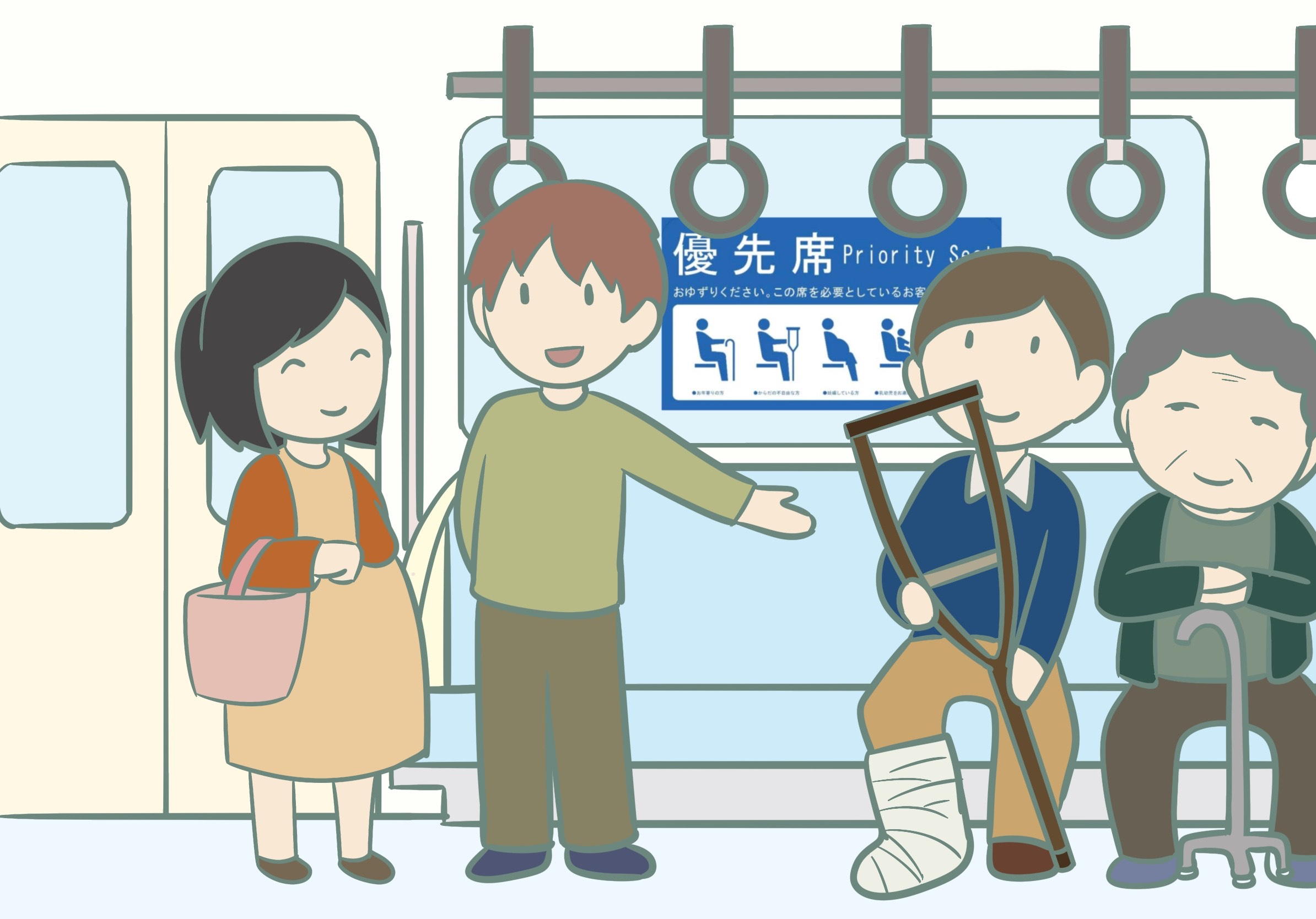 電車や バスには、優先席が あります。体が 不自由な 人、お年寄り、妊婦(お腹に 赤ちゃんが いる 人)や 子どもと 一緒に いる 人、怪我を している 人などのための 席です。優先席には、優先席の マークが ありますから 分かりやすいです。電車が すいているときは、誰でも 座ることが できますが、体が 不自由な 人などが 乗ってきたら、席を 譲ります(「どうぞ」と 席を 立ちます)。