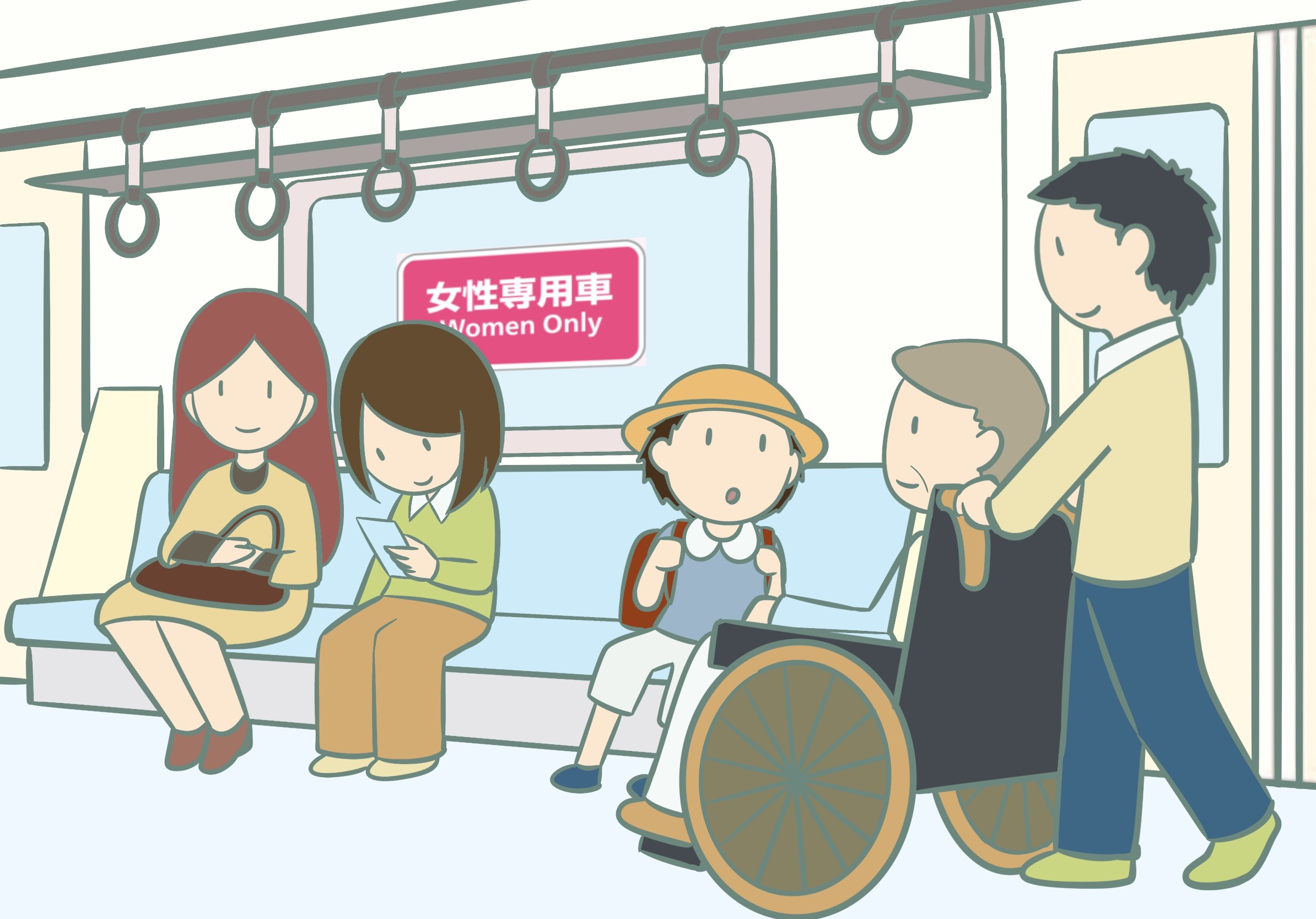 女性だけが 乗ることが できる 車両です。男性でも、小さい 子ども、体が 不自由な 人、体が 不自由な 人の 世話を する 人も 乗ることが できます。女性専用車は、朝、電車が 混んでいる 時間(7時~9時くらい)に あります。夜にも 女性専用車が ある 電車が あります。電車の 会社で 女性専用車が ある 時間が 違います。女性専用車は、一番 前の 車両か、一番 後ろの 車両が 多いです。