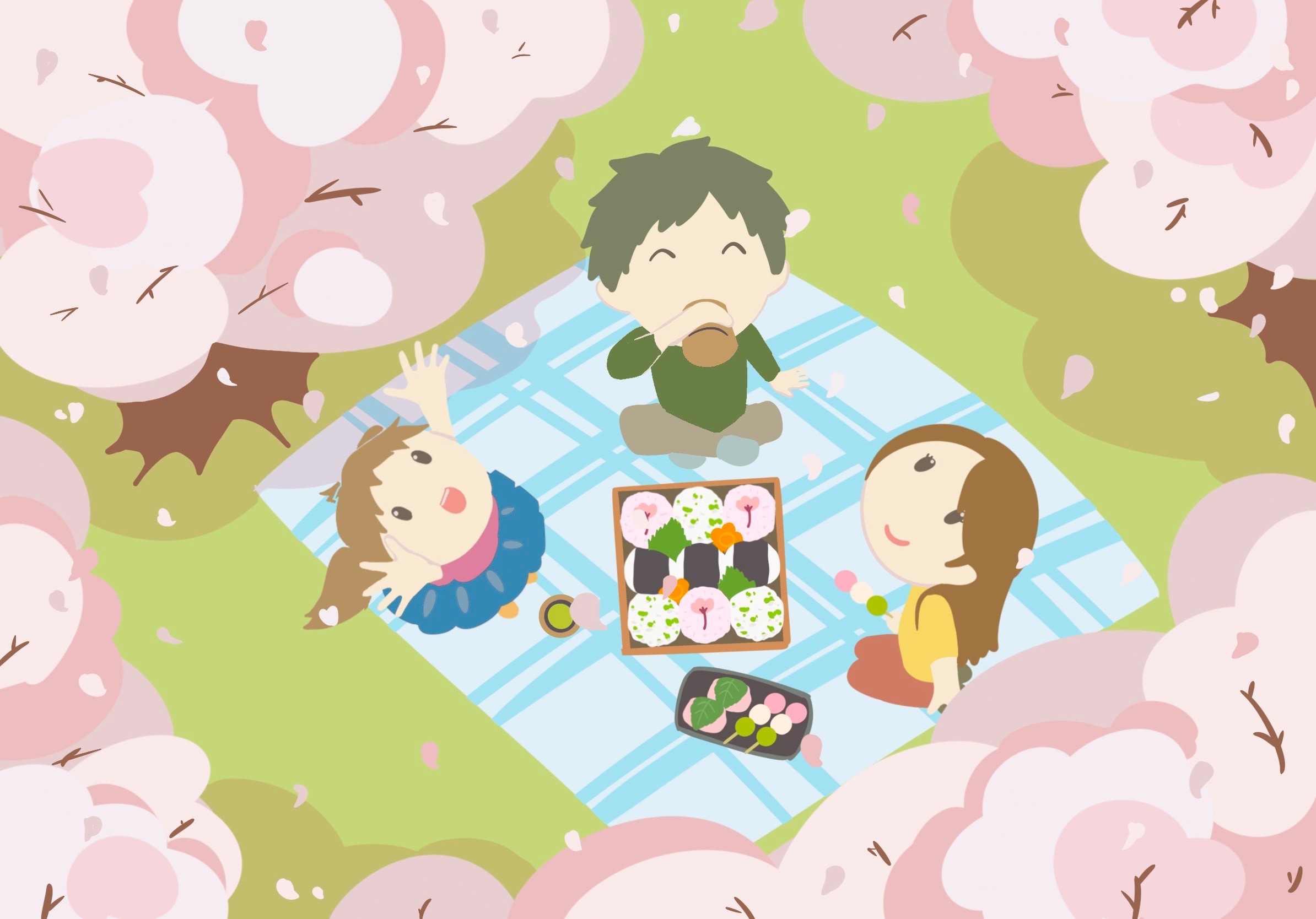 桜を 見に 行くことです。桜の 花を 見ながら、散歩を したり、食事を したり します。家族や 友達と お花見に 行ったり、会社の イベントで お花見に 行ったり します。夜、桜を ライトアップ(lights up)している 場所も あります。夜桜[夜の 桜]も きれいです。