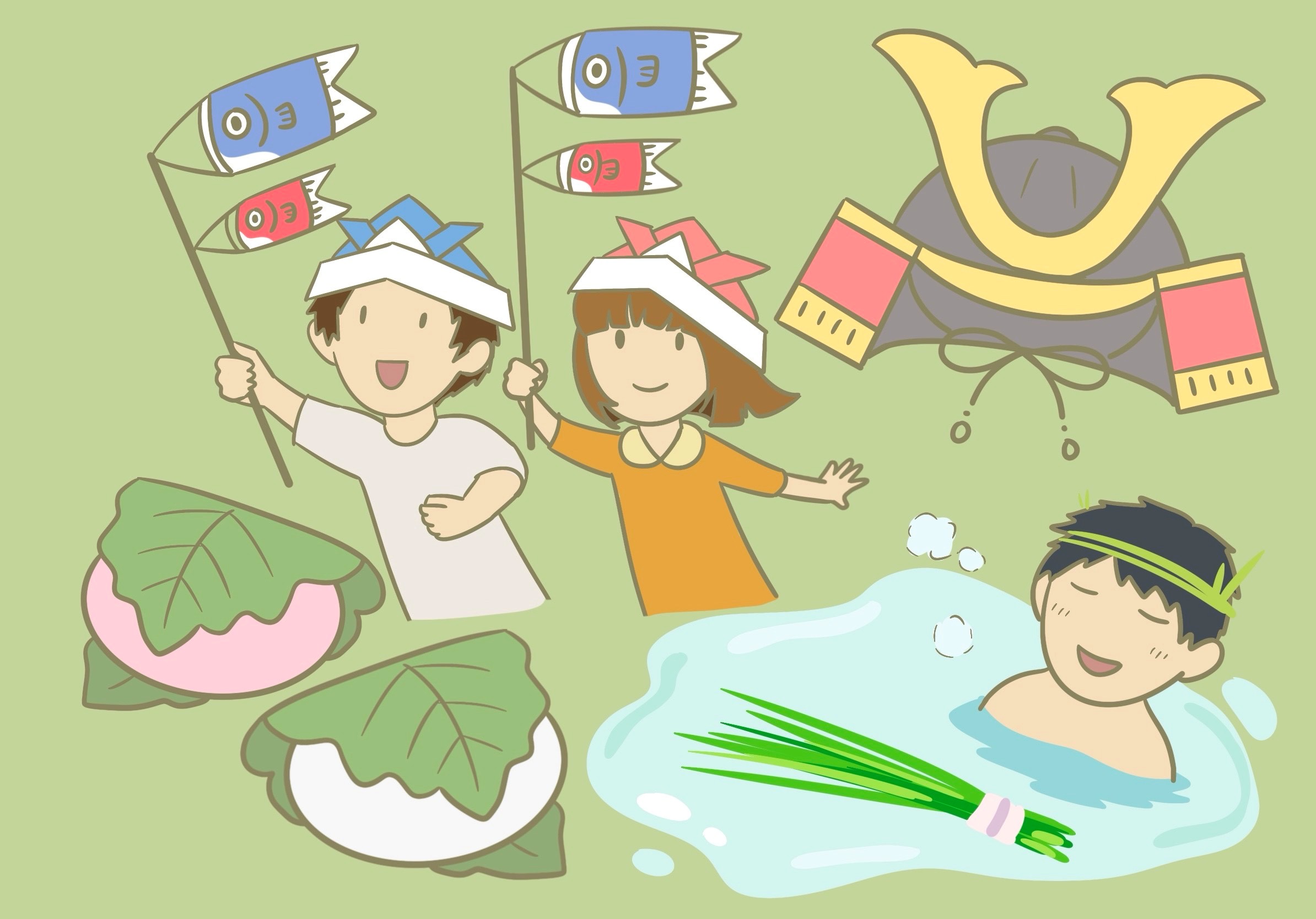 鯉のぼり ・ 兜 ・ 菖蒲湯(しょうぶ湯)・柏餅