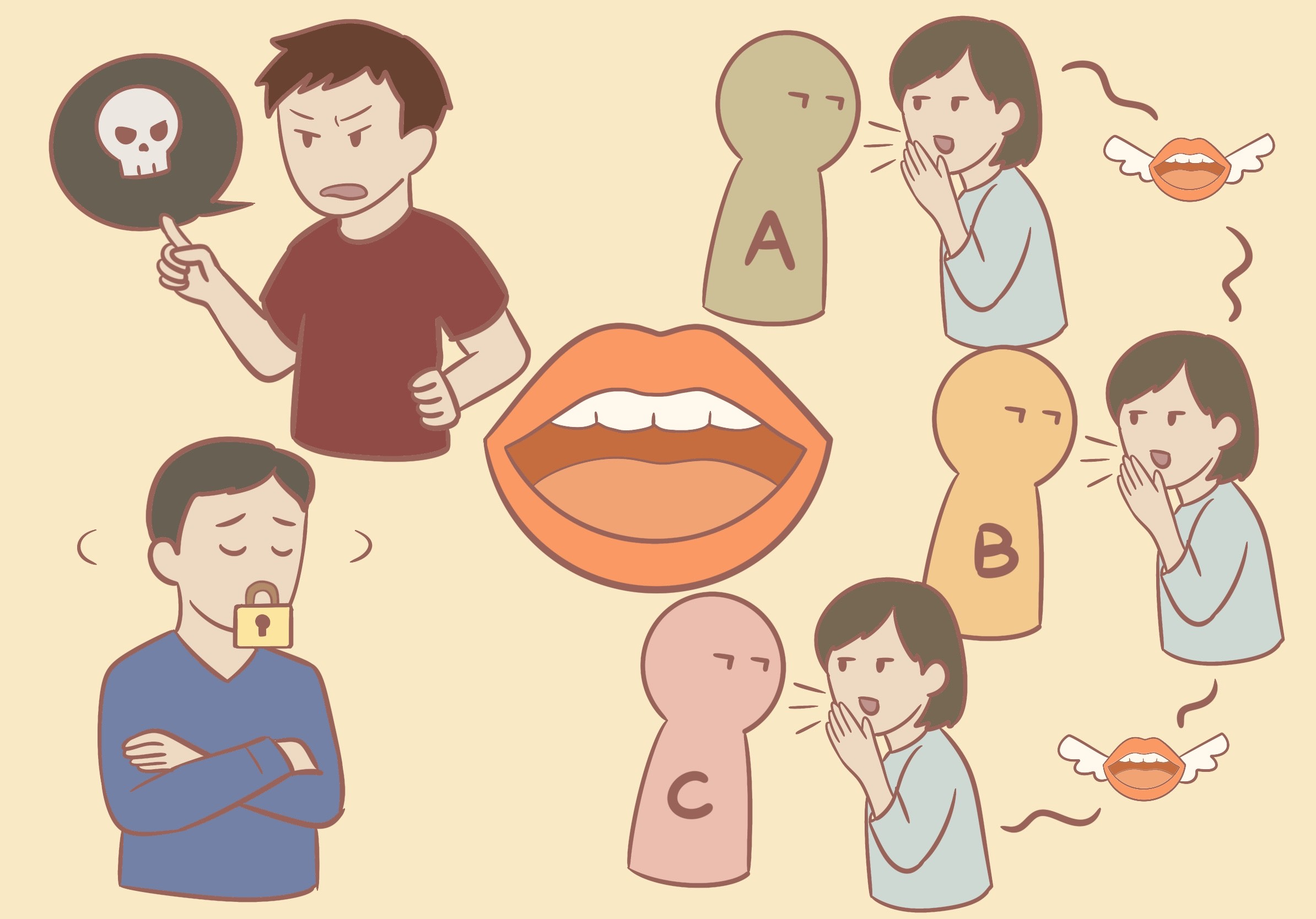 慣用句は、「手」や 「足」などの 体の 言葉を よく 使います。今月は、知っていると 便利な「口」を 使った 慣用句を 紹介します。