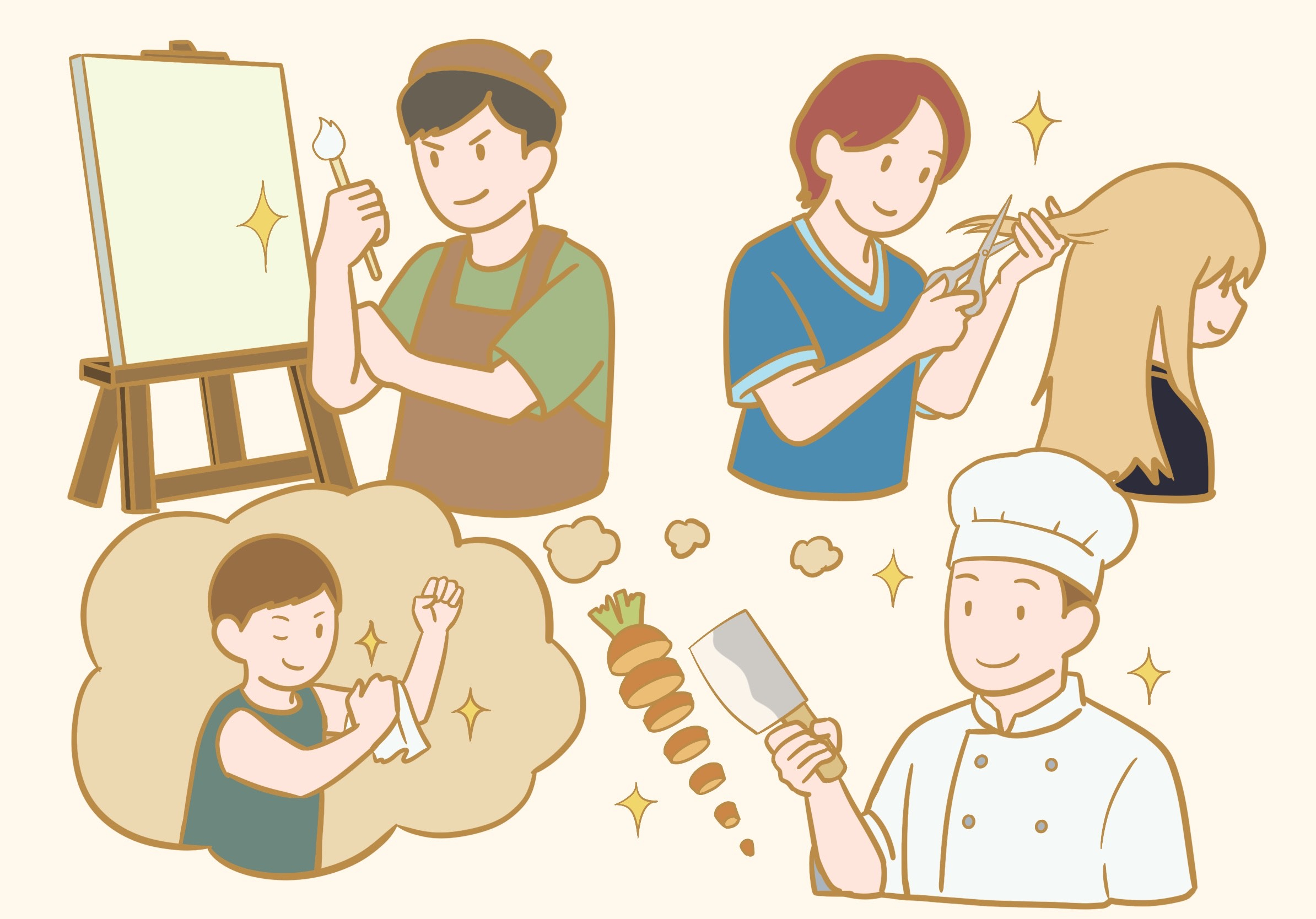 B:料理が 好きだから、シェフになりたいんだよね。将来は、料理の 学校に 行って…、それから、フランスに 留学して…、どんどん 料理の 腕を 磨きたいと 思ってるんだ。