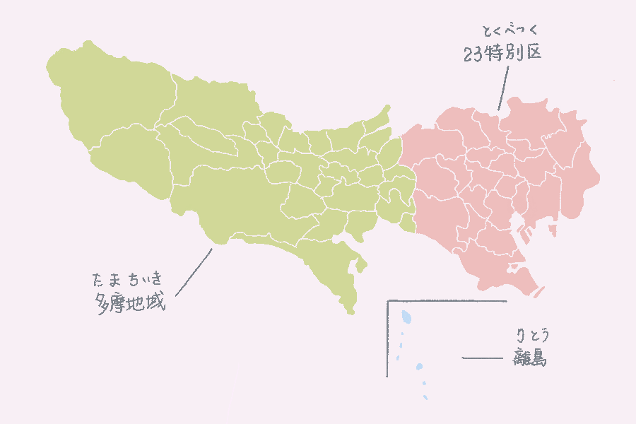 東京の 形は、東から 西まで 横に 長いです。東には、23の 区が あります。「特別区」と いいます。会社や 学校、国の 仕事をする 大切な 場所が たくさん 集まっています。西には、多摩地域が あります。自然が 多くて、山や 湖なども あります。多摩地域には、26の 市と、5つの 町、8つの 村が あります。東京には、島も あります。伊豆諸島や、小笠原諸島です。小笠原諸島は、東京から 1000km 離れています。