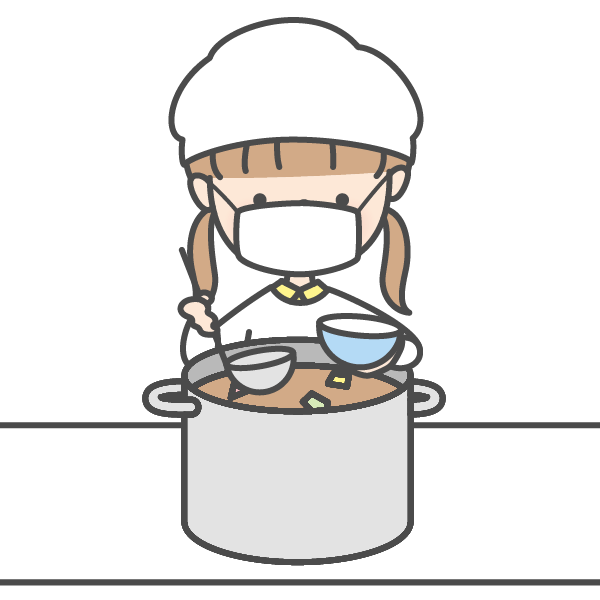 給食当番の 仕事は、クラスの みんなの 中で 毎週 変えます。使った 給食着<服>は 給食当番の 人たちが 金曜日に 持って帰って、洗います。