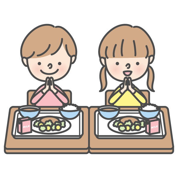 教室で みんなで 食べます。学校の 給食は、子どもの 成長<体が 大きくなること>と 健康を 考えて 料理を 作ります。